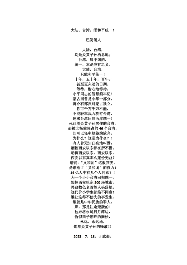 大陆、台湾,须和平统一